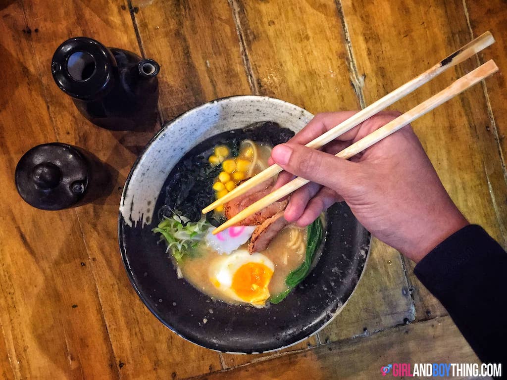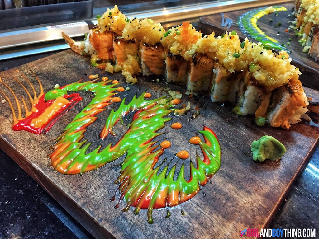 In this resto, I saw one of the creative servings of Maki. It tastes good too. It has shrimp, salmon, and tempura crumbs on top. That dragon art is actually wasabi. Cool right?