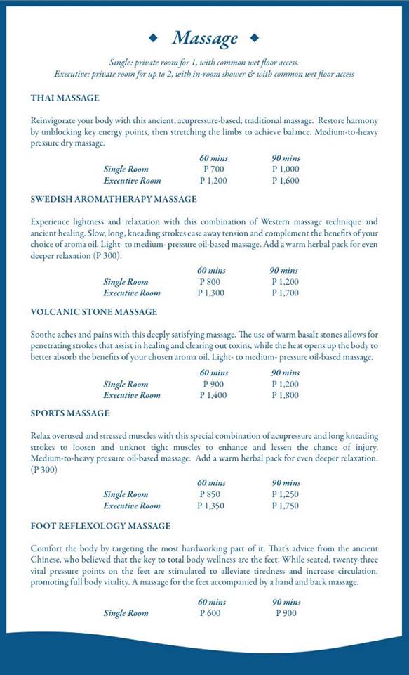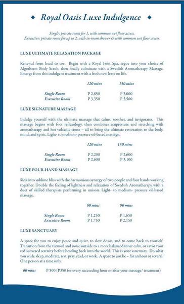 Royal Oasis Luxe Spa’s newest branch offers several relaxation and massage services done by professional massage therapists who undergo several trainings and seminars regularly to keep them updated with the latest trends and techniques when it comes to relaxation practices. You might want to check out the list of services below: