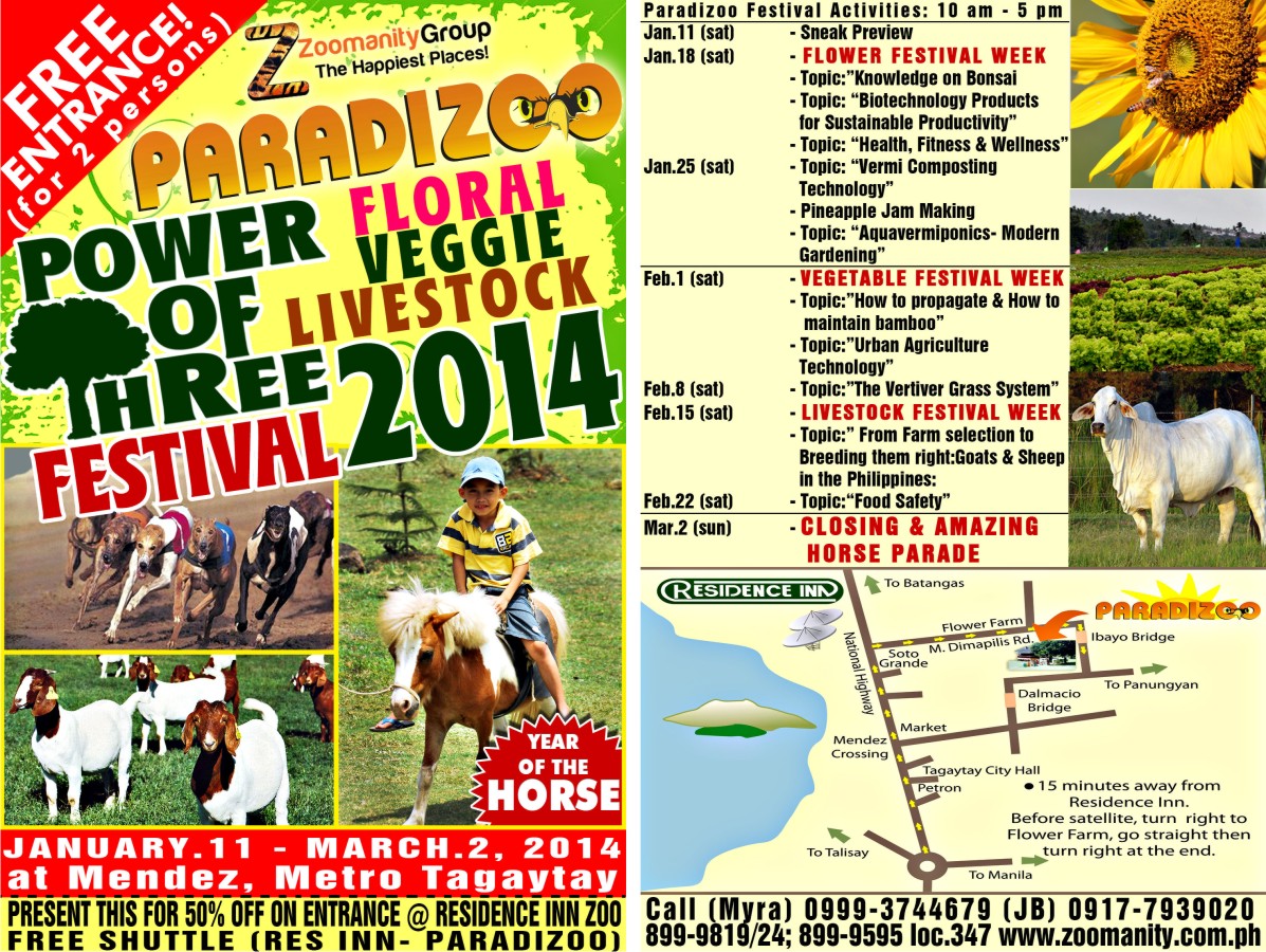 In celebration of the year of the International Family Farming, experience one of the most anticipated annual festivities in the field of agriculture as Paradizoo re-unfold “Power of Three” (floral, vegetable and agri-livestock fair). Join us from the sneak preview this January 11 to closing on March 2 featuring an amazing Horse Parade, a gala for this year of the horse. See different breeds of horses from thorough breed to miniature horses, display their beautiful statures as they parade together with their colorful and magnificent carts. Also develop and enjoy your understanding towards agriculture as you will learn the Best Practices in agriculture. They will exhibit and display farm produce, sale and auction of livestocks (imported breeds of goats for milk and meat, sheep, several pig breeds animal feed, and a lot more). There will be briefings, discussions on breeding programs and free seminar on flower, vegetable and livestock care.