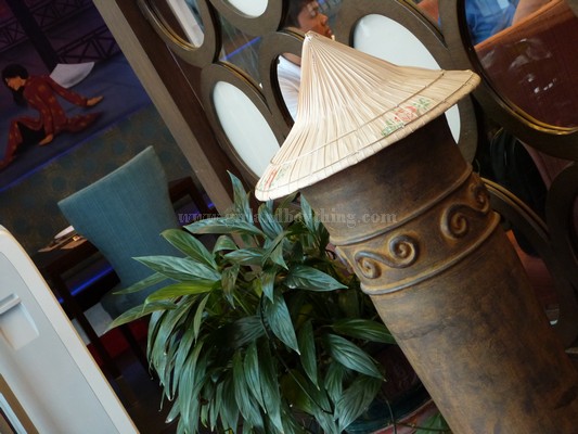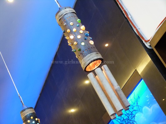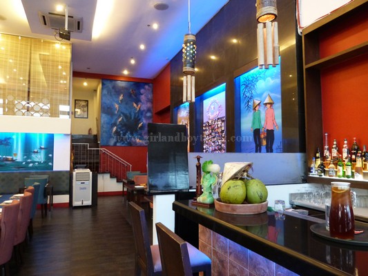 The place looks  cozy, clean and warm lighted. Some interiors inside shows Asian in style. Paintings used reflects water-inspired pictures.