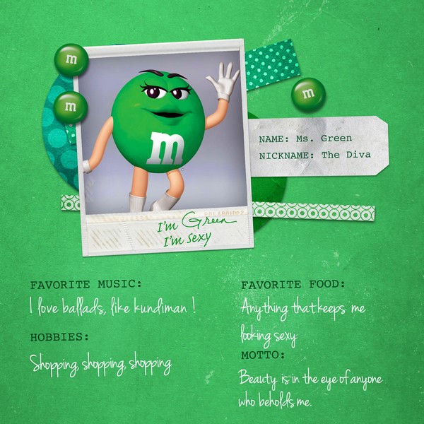You will enjoy a treat-your-self day with Green. She will take you out shopping, get your hair done and your nails painted too! Expect a total make-over when hanging out with Green because she believes that an M&M’S has to look good to feel good.