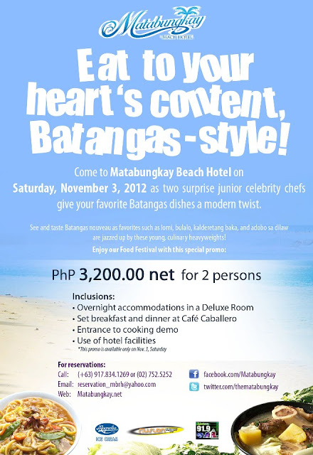 This November 3, 2012, Matabungkay Beach Hotel (MBH) will be holding its Batangas Food Festival where there will be cooking demonstrations to be done by 2 Junior celebrity chefs and each food demo will feature popular dishes of Batangas with a culinary touch. These dishes will be included in Matabungkay Beach Hotel’s menu for the whole November. Entrance fee to the event is only PhP200.00.