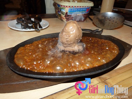 Sizzling Ice Cream- Chocolate ice cream on top of sliced Batangas Cupcake with caramel and Batangas Lambanog on a sizzling plate.