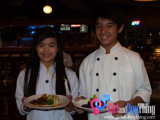 Former contestants of the first Junior Master Chef Philippine Edition, Jobim Jalbuena(cooked the Binarakong Baka) and Tricia Baylosis(cooked the Kalderetang Kambing with Couscous Rice) at the Matabungkay Beach Hotel Food Festival.
