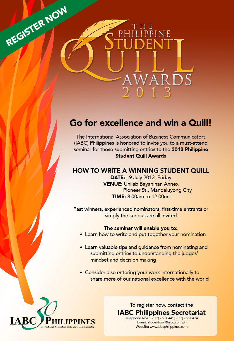 IABC Philippines will be conducting seminars on HOW TO WRITE A WINNING QUILL for both Students and Professionals. Please refer to the posters below for details.
