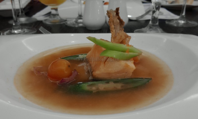 This SALMON SINIGANG is made of roasted norweigan salmon filet in traditional sinigang broth. It comes with cherry tomatoes, okra, salmon skin chicharon and ebiko. Served with a glass of Benchmark, Chardonnay, South Australia, 2013.