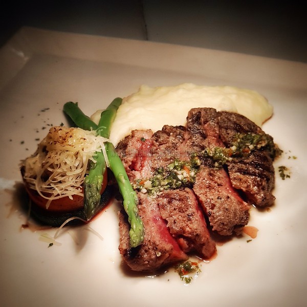 This dish is made up of Grilled Angus beef steak, served with brazilian, chimichuri sauce, potato puree, sauteed asparagus and roasted cherry tomatoes. Also served with a glass of Benchmark, CabernetSauvignon, South Australia, 2013.