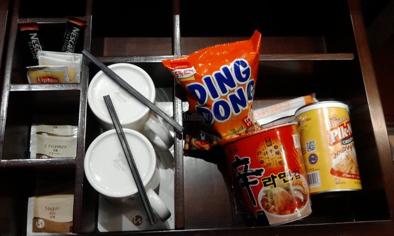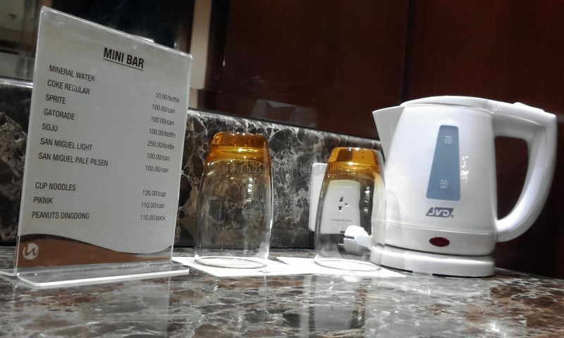 My room has it’s own refrigerator stuffed with different refreshments. Above the refrigerator is a drawer stocked with coffee and snacks. Reminder: drinking and eating one of these will be charged to your account. Don’t worry, just in case that you get thirsty, WIDUS Hotel and Casino provided 2 complimentary mineral water.