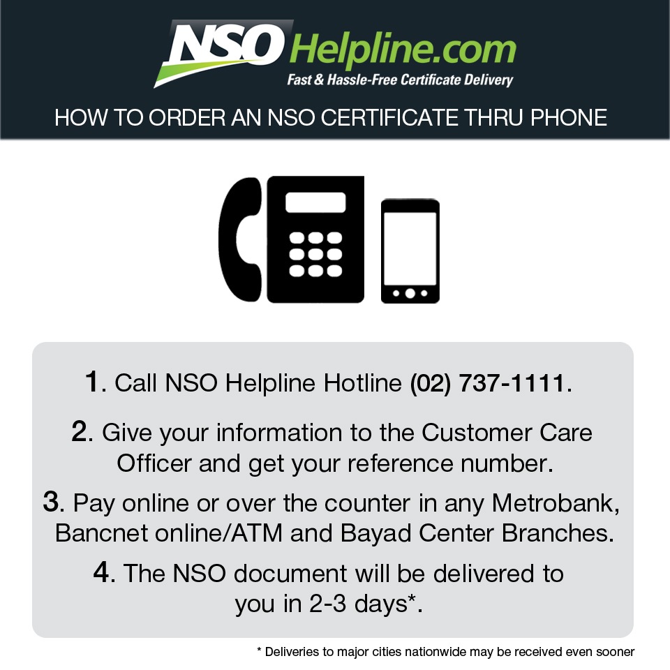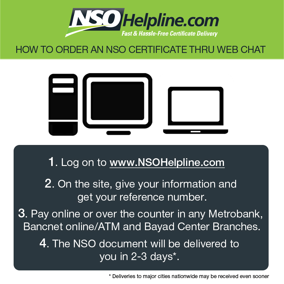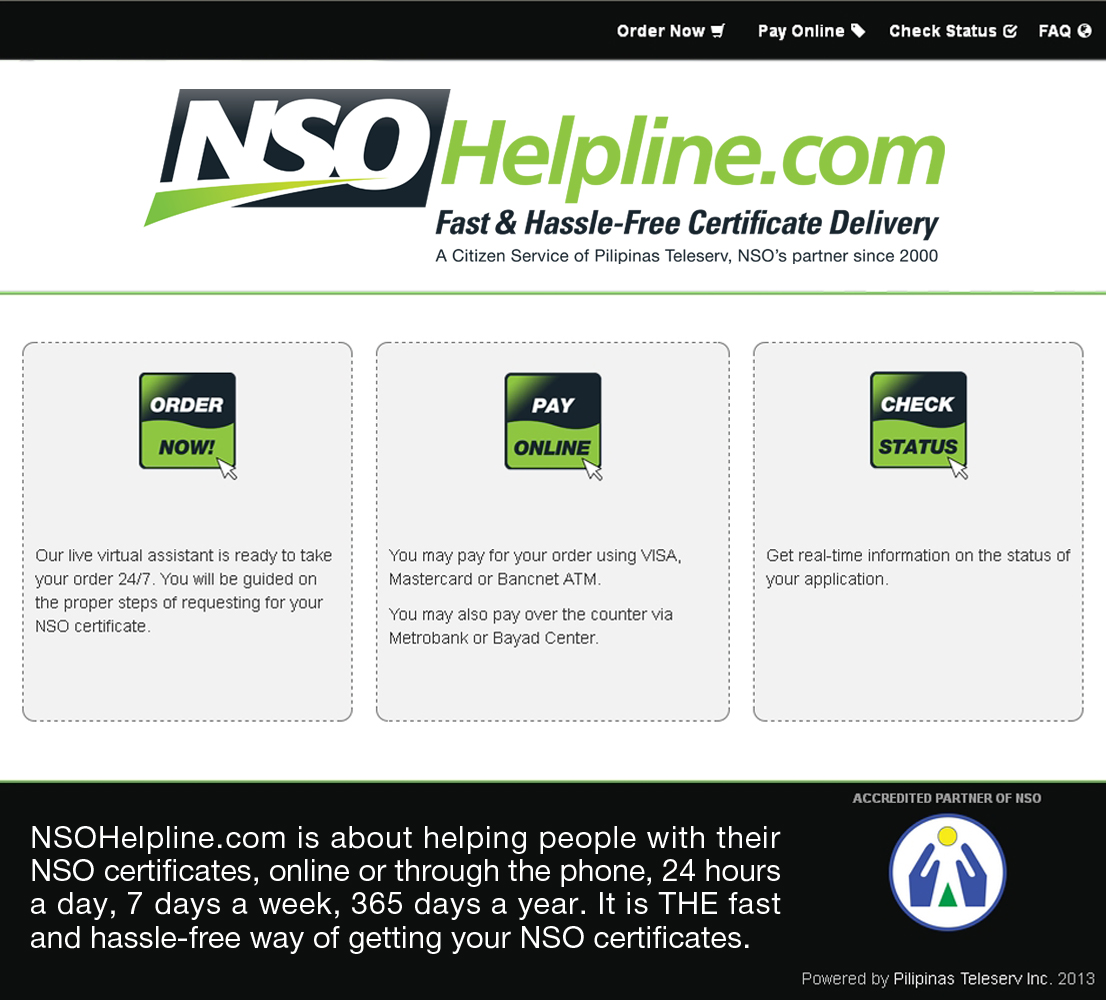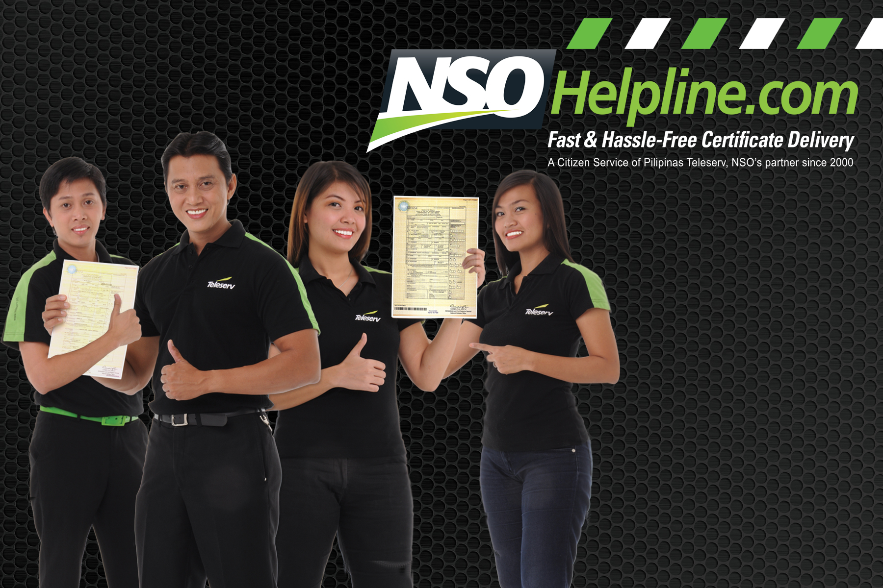 Now with NSOHelpline.com, a citizen service of Pilipinas Teleserv, an NSO(National Statistics Office) partner since 2000, which offers a new and comprehensive way of having your NSO certificates delivered to your door steps hassle-free, answers your inquiries, and finding solutions to your certificate concerns online.