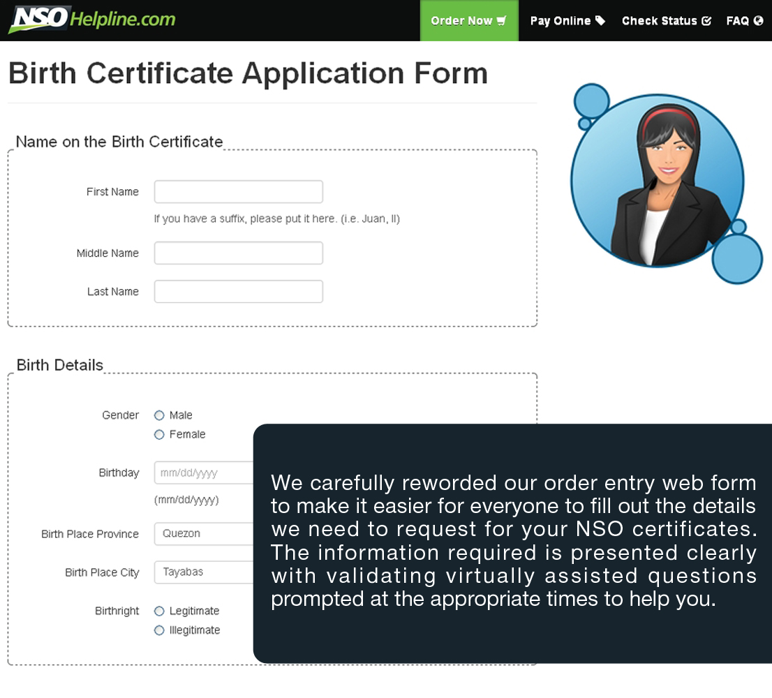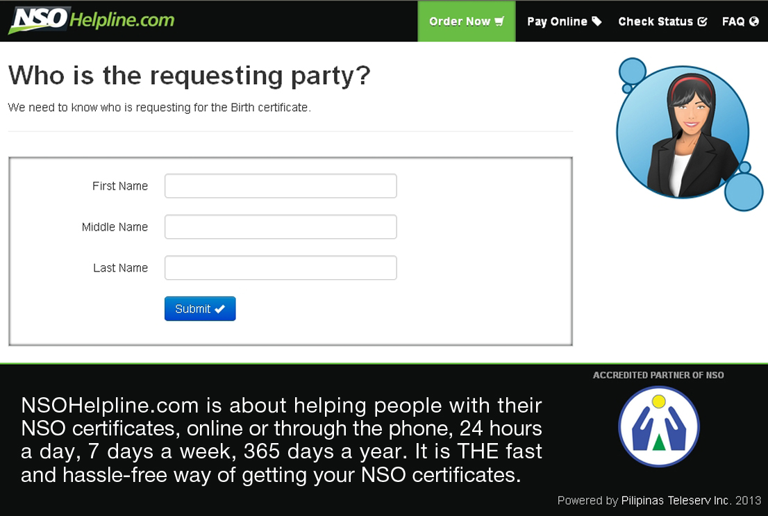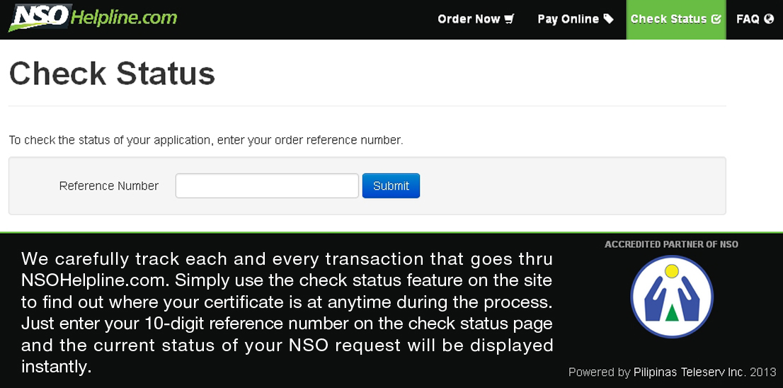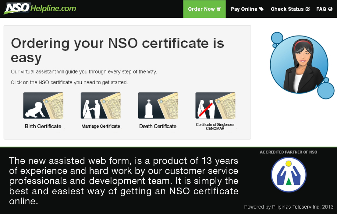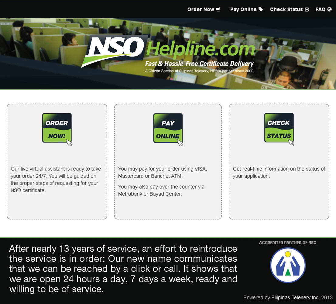 Now with NSOHelpline.com, a citizen service of Pilipinas Teleserv, an NSO(National Statistics Office) partner since 2000, which offers a new and comprehensive way of having your NSO certificates delivered to your door steps hassle-free, answers your inquiries, and finding solutions to your certificate concerns online.