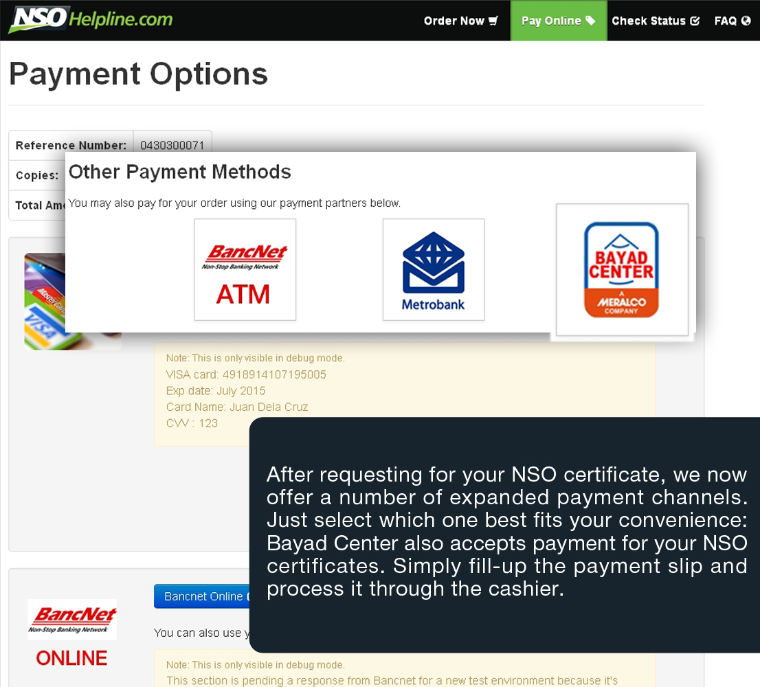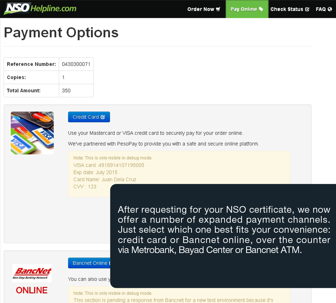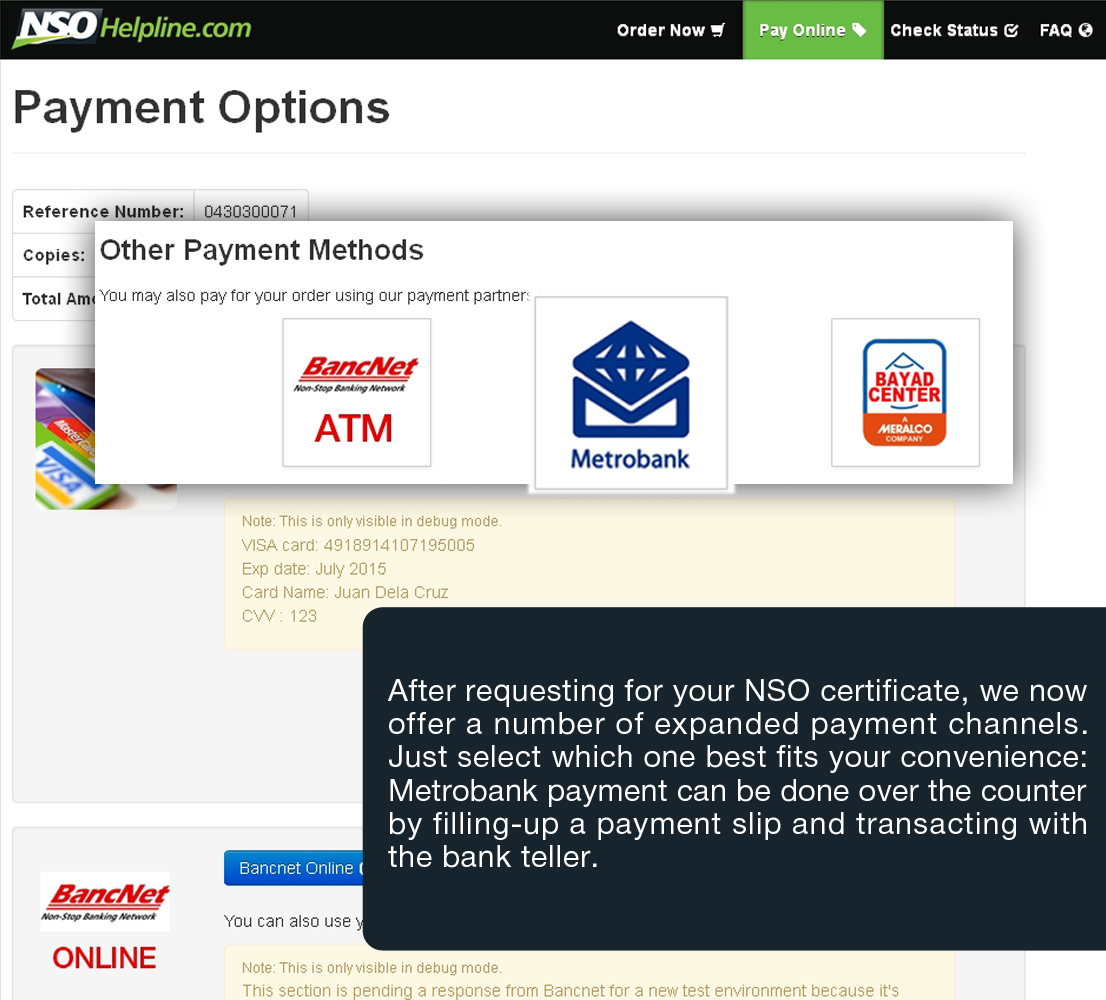 For Payment Options, You can pay thru Credit Card, BANCNET ONLINE and ATM, over the counter payment tru Bayad Center , and Metrobank.