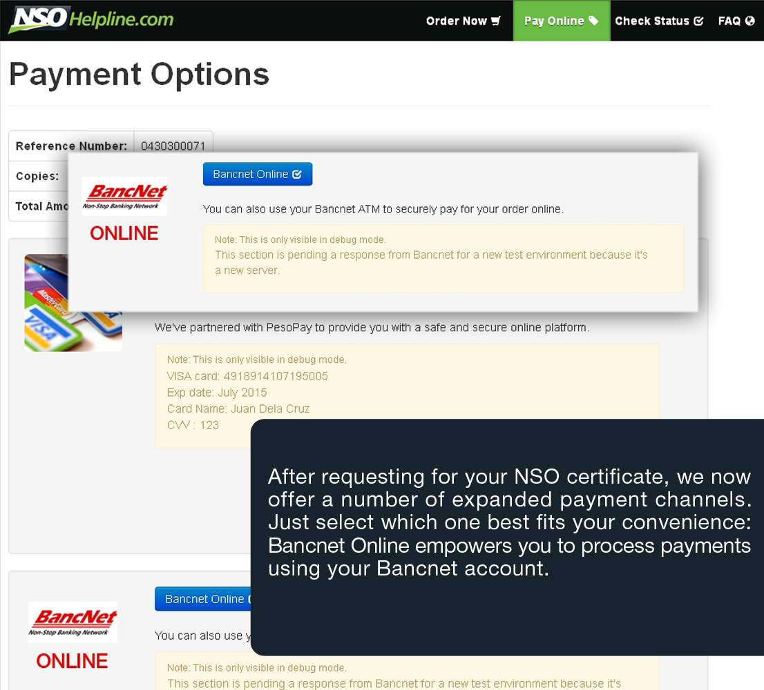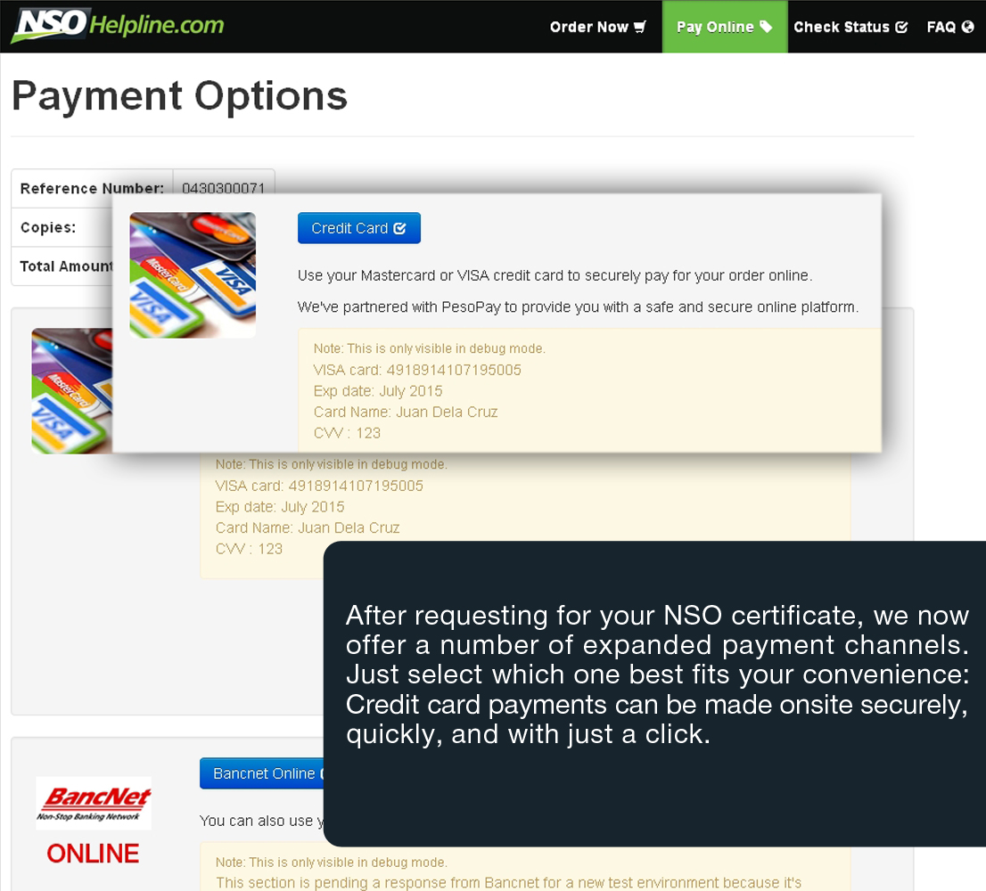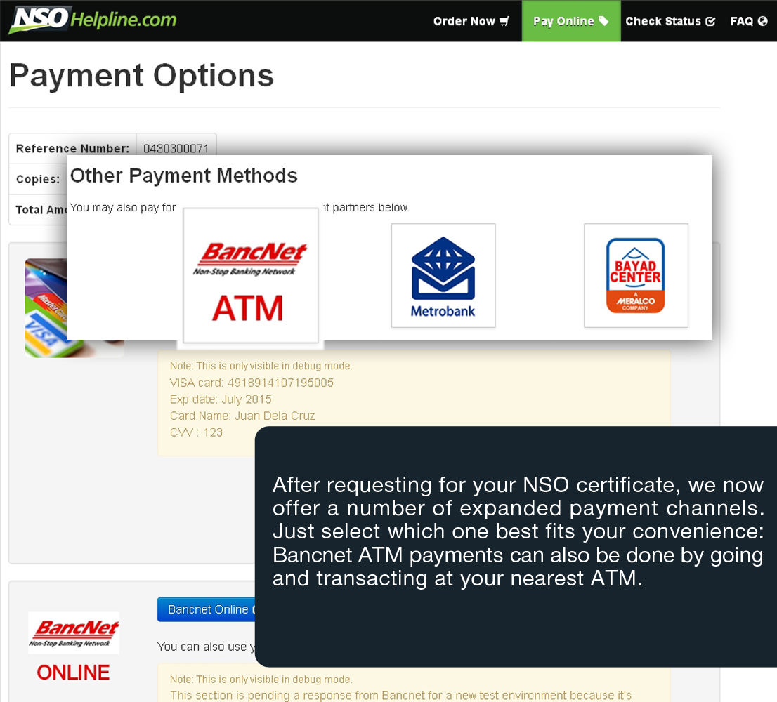 For Payment Options, You can pay thru Credit Card, BANCNET ONLINE and ATM, over the counter payment tru Bayad Center , and Metrobank.