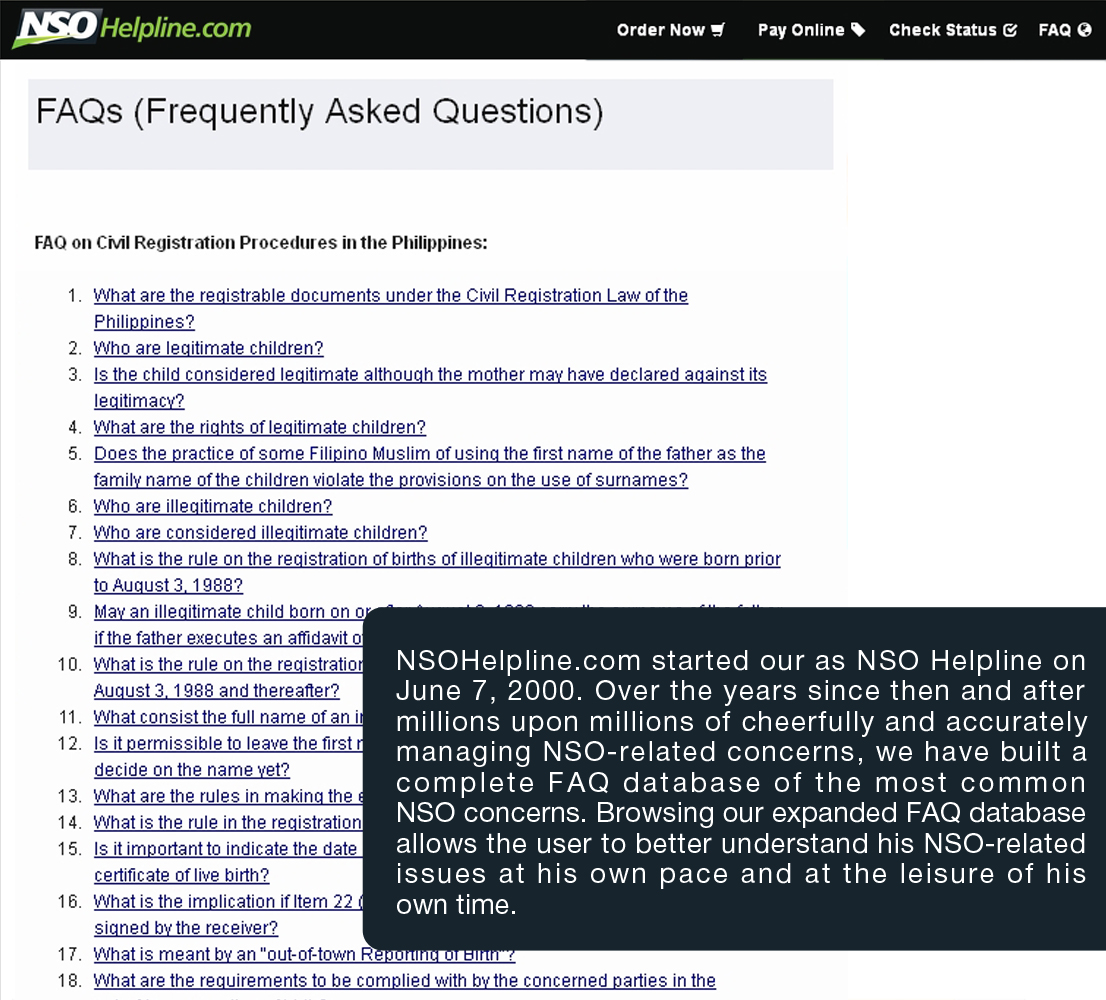 NSO Helpline.com also has a Frequently Asked Questions (FAQ) for your inquiries and questions regarding different NSO Certificates and appplication.
