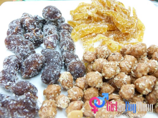 Spicy mango, Thai Sweet Tamarind, Dilis with sesame seed(not in the photo)Peanut with Sesame seed, Dried Coconuts(not in the photo).