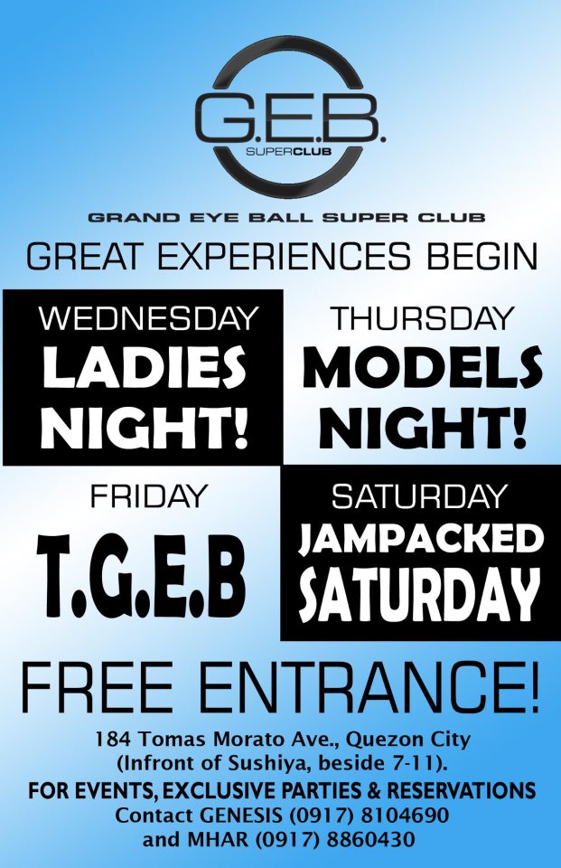 Located at the heart of Tomas Morato, Quezon City, comes a place where you can groove in high energy sounds, socialize and party hard. Opened and launched last November 2012, G.E.B. became a hub of nightlife for people to sit back, sip a drink and loves to dance and party as it caters any group of people who have the heart for for good conversation, recreation and socialization.