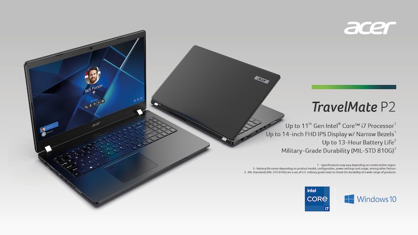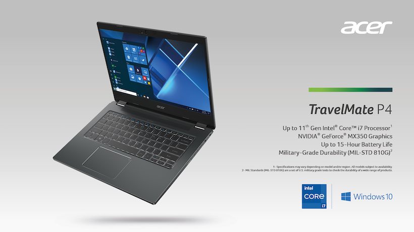 Featuring 11th Gen Intel® Core™ processors with Iris® Xe graphics or up to discrete NVIDIA® GeForce® MX350 GPUs and up to 32 GB DDR4 RAM, 4 lane PCIe SSDs, and 1 TB M.2 SSD storage, the TravelMate notebooks deliver plenty of power. Very reliable, users can also expect to get a full day of work out of each device. The Acer TravelMate Spin P4 and TravelMate P4 notebooks’ batteries last up to 15 hours, while the while the TravelMate P2 gets up to 13 hours3 of battery life.