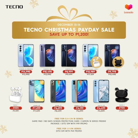 This Christmas season, TECNO Mobile is giving shoppers the chance to enjoy special discounts and deals on the CAMON 18 Series, and other awesome smartphones and AIoT products from the brand. Visit the TECNO Mobile Flagship Store in Lazada, and the TECNO Mobile PH Official Store in Shopee Mall to catch the TECNO Pre-Holiday Sale on December 12 to 14, 2021, the TECNO Christmas Payday Sale on December 15 and 16, 2021, and the TECNO Holiday Sale from December 22 to 26, 2021.