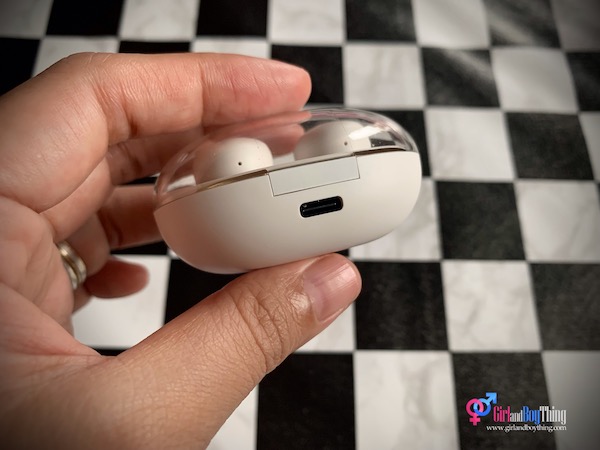 Docked in the case, you’ll find the two oval-shaped earbuds, and that shiny portion is the Intelligent touch control where you can use to answer calls, control playback, and activate/deactivate Game Mode. The earbuds has a nice fit and it does not easily fall off when walking and running. If it’s falling off, I suggest that you change the ear tips. For me the best fit is the smallest one.