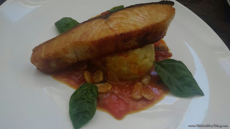 Oven baked salmon fillet served with mashed potato.