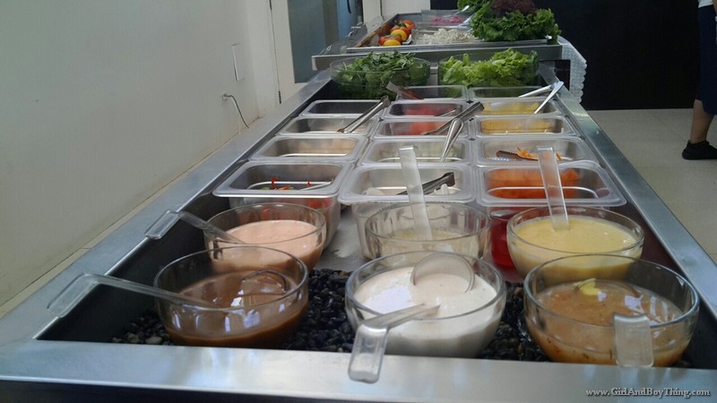 An open Salad bar with different salad dressingd to choose from. You can actullly buy these salad dressings in Gourmet Farms’ Store.