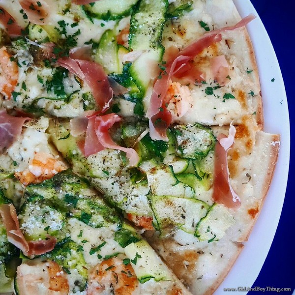 Parma ham, shrimps, zucchini and white sauce.